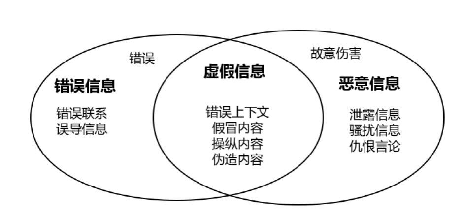 联合国教科文组织出版的《新闻业:假新闻和虚假信息》报告中指出,虚假信息通常是指故意向受众提供不诚实的信息来迷惑或操纵受众。并就错误信息、虚假信息和恶意信息作出区别(如图所示)。
