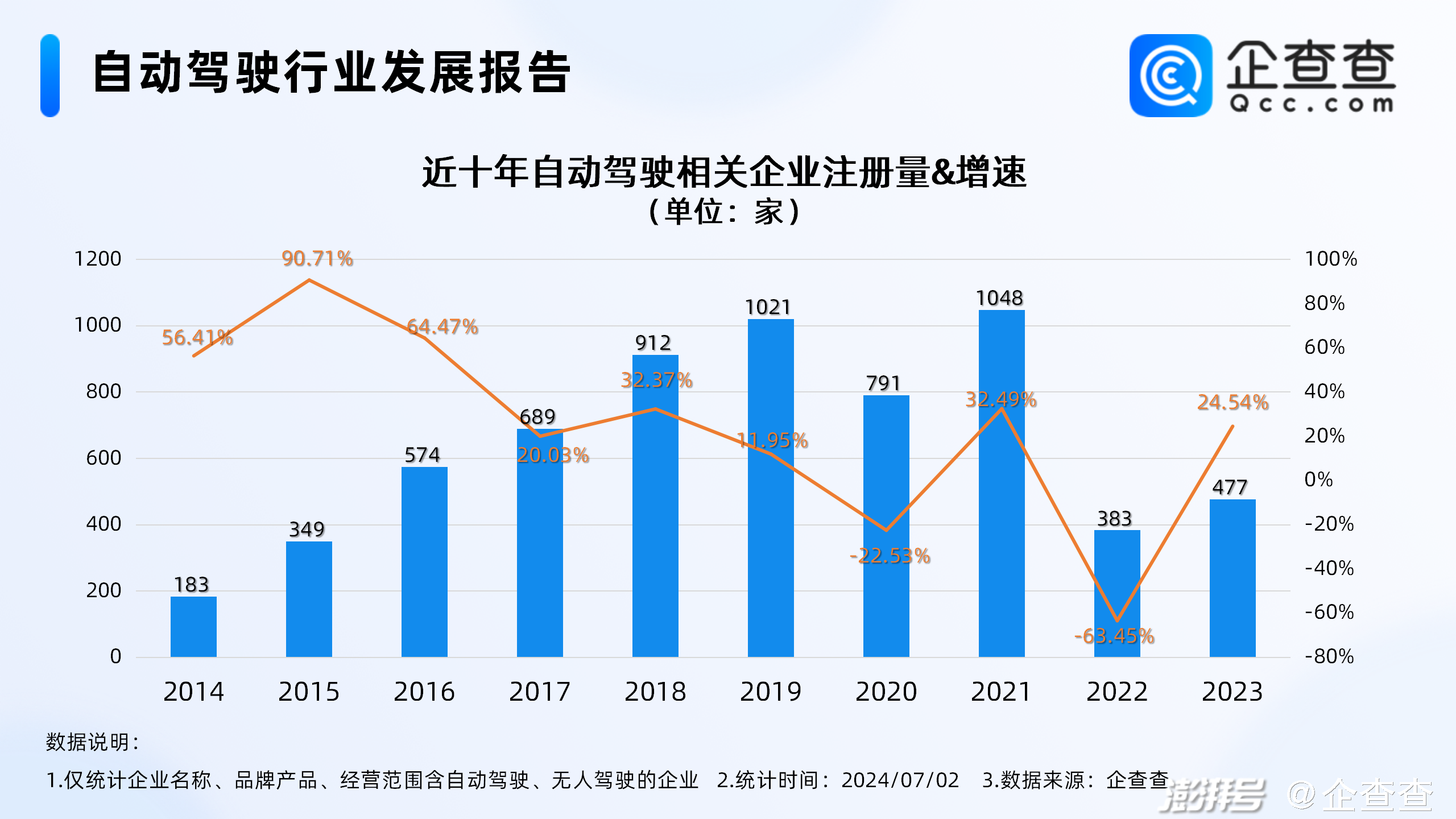 企查查数据显示,我国现存5539家自动驾驶相关企业,近十年其注册量呈现波动式增长态势,2019全年注册1021家,达近十年注册量小高峰;2021年全年注册1048家,同比增长32.49%,达近十年注册量高峰。2023年全年注册477家,同比增长24.54%。