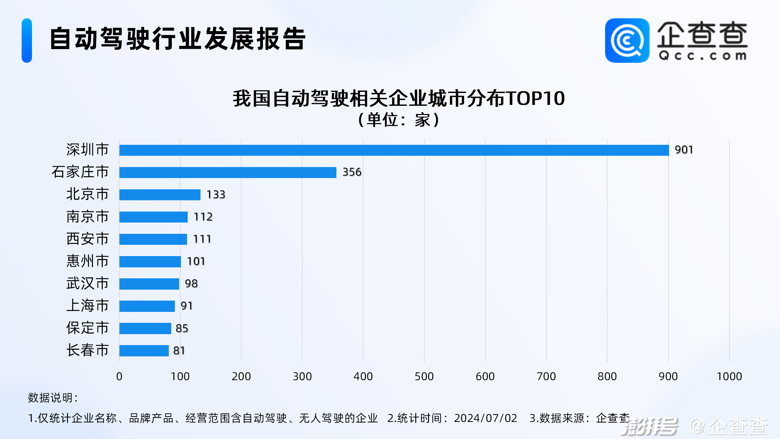 企查查数据显示,从城市来看,深圳现存901家自动驾驶相关企业,遥遥领先全国其他城市,居全国首位。石家庄、北京分别现存356家、133家,居全国前三。此后是南京、西安、惠州等地。