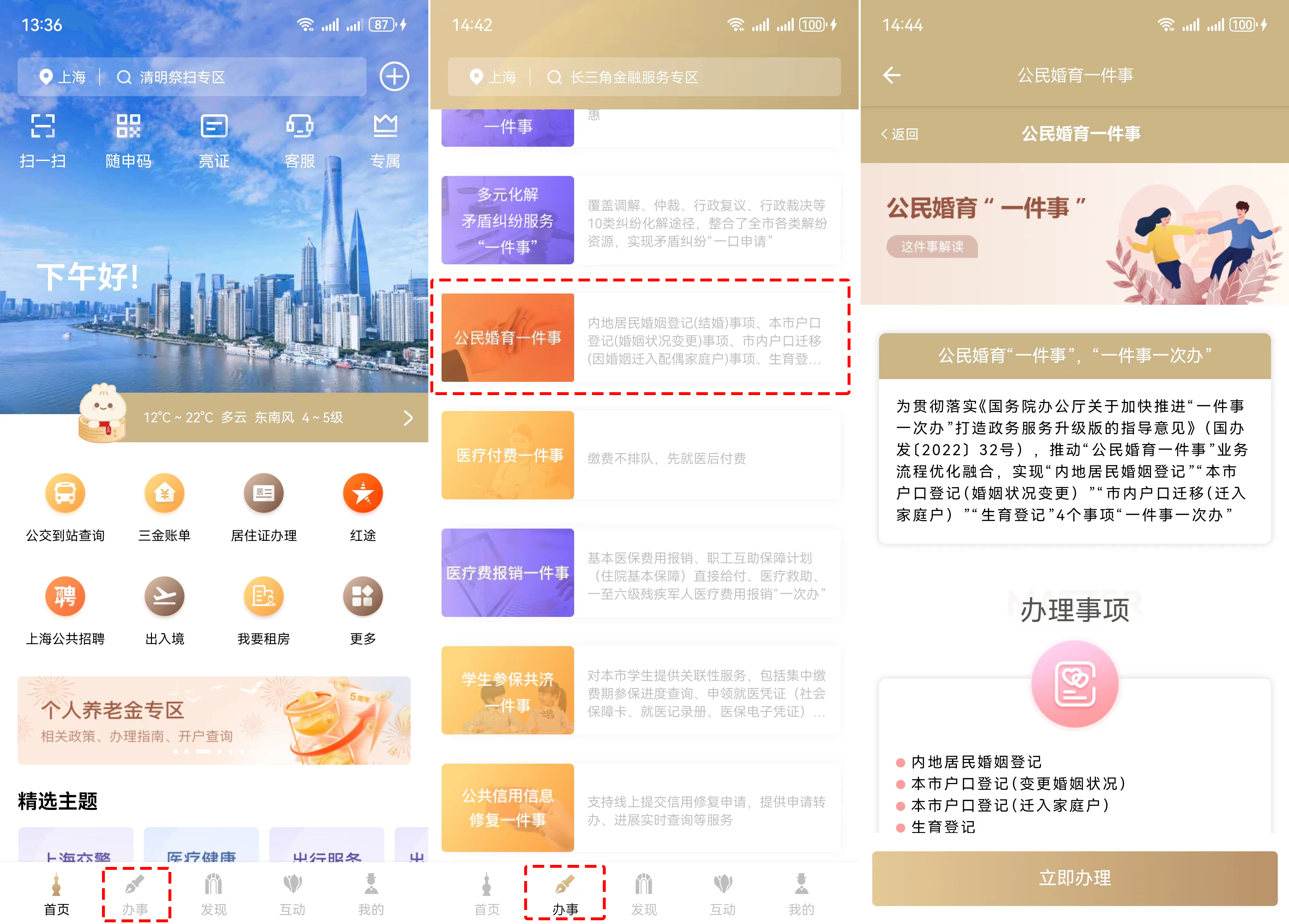 实名登录“随申办市民云”APP→进入“办事”频道,点击“公民婚育一件事”进入服务