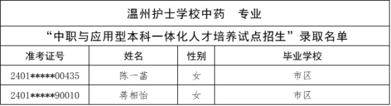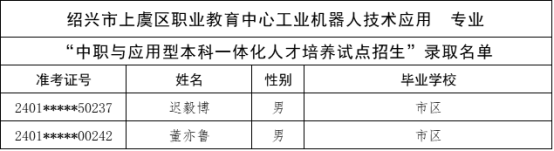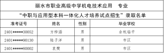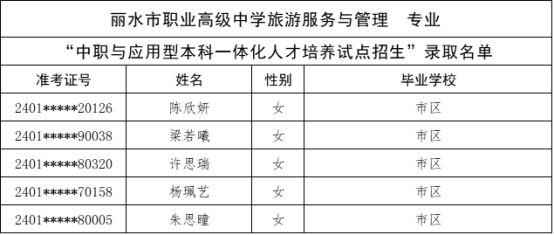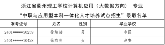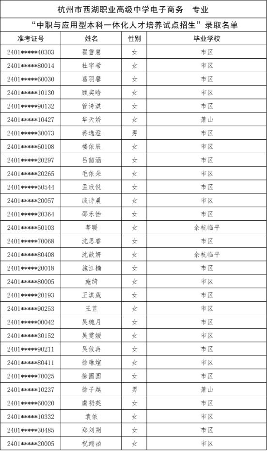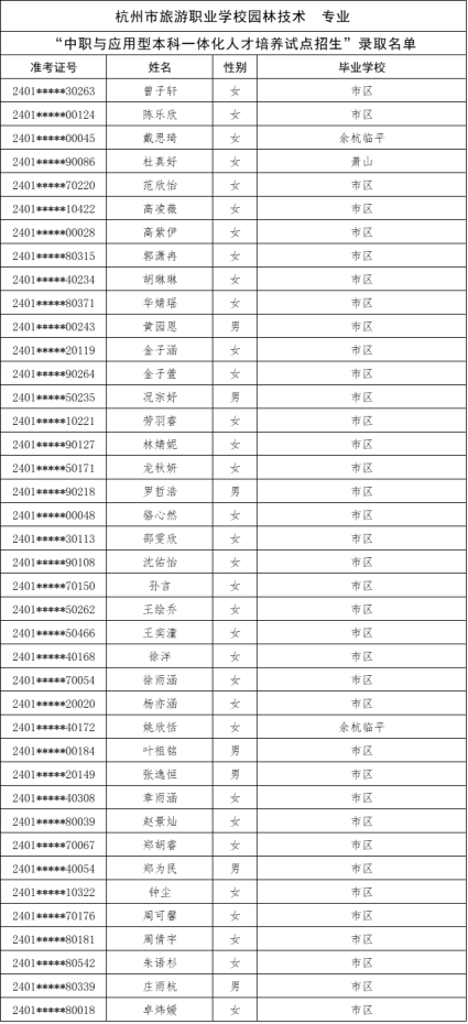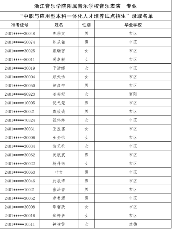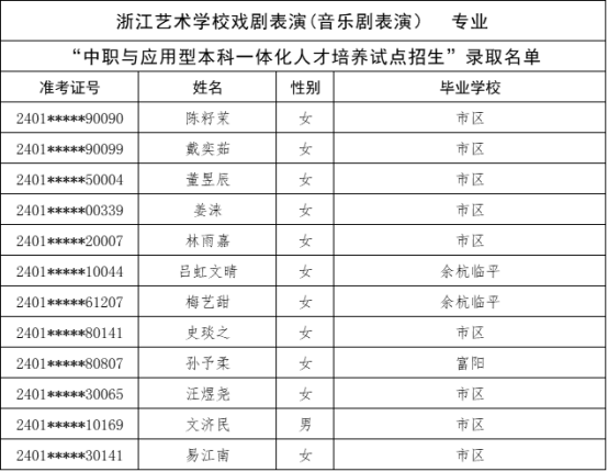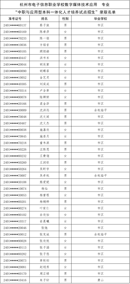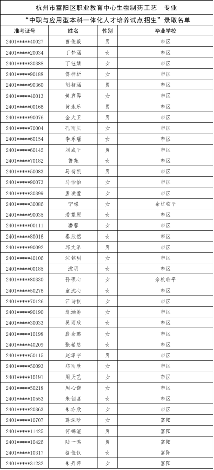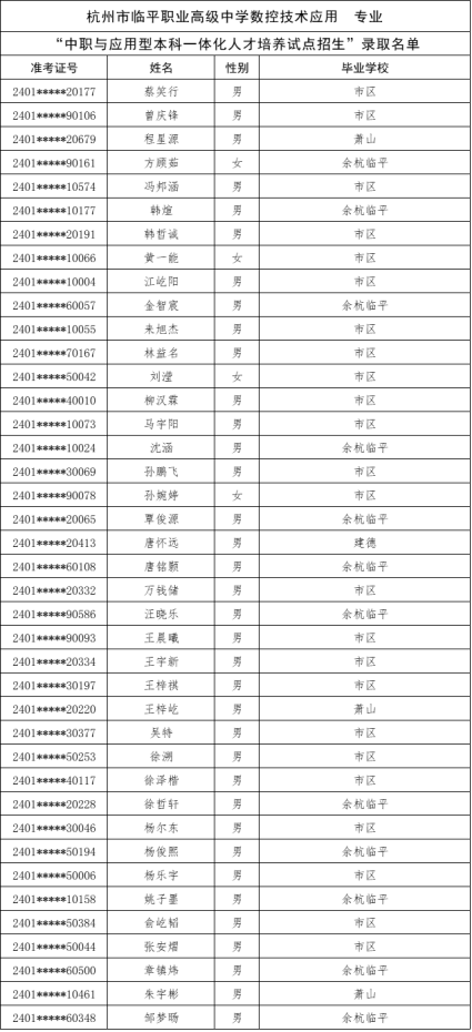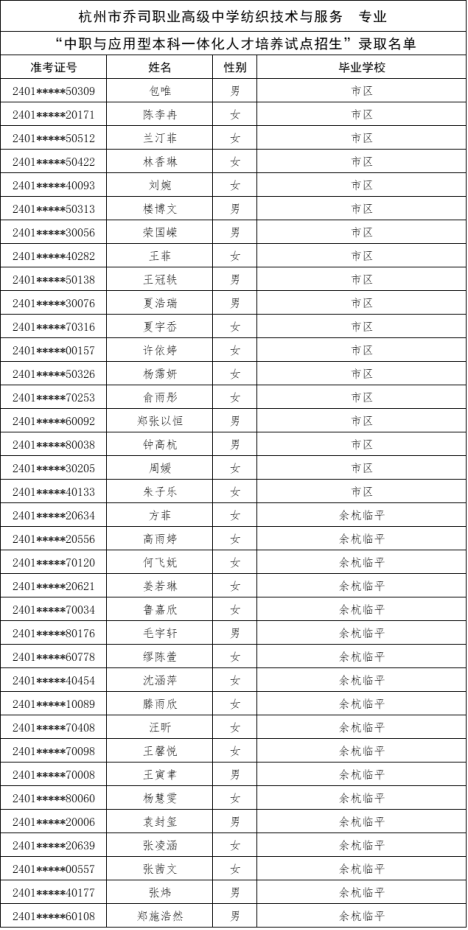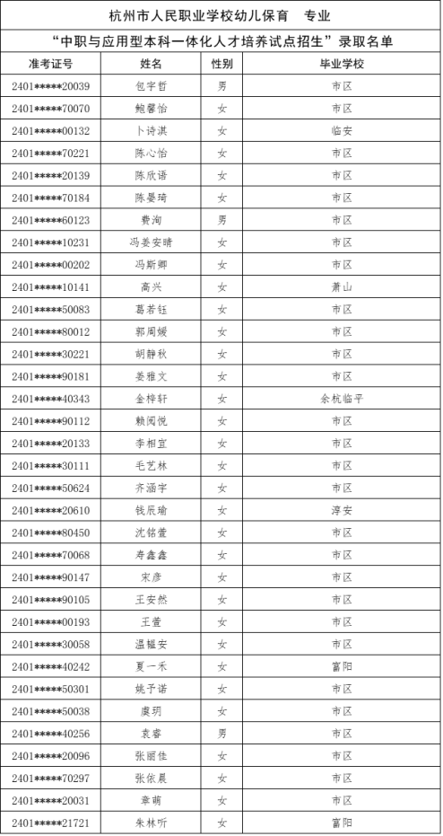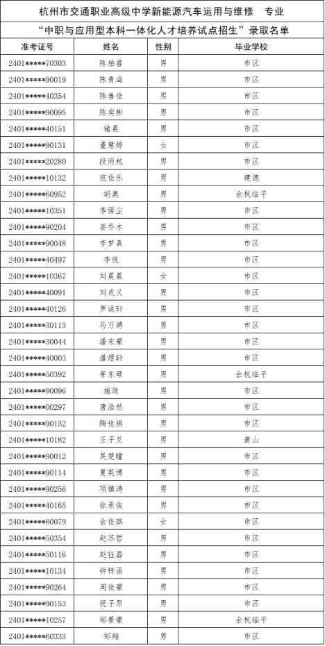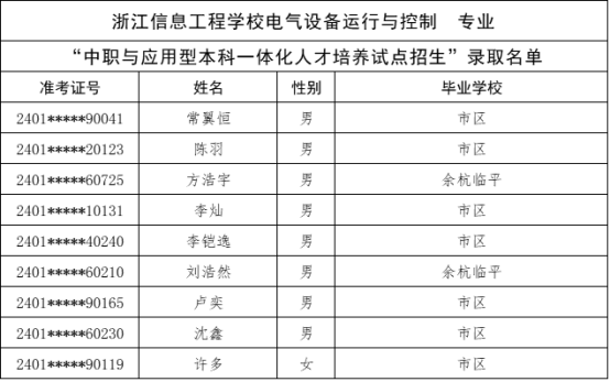 根据《杭州市教育局办公室关于做好2024年中职与本科一体化人才培养招生工作的通知》(杭教办职成〔2024〕80号)精神,现将我市“2024年中职与本科一体化人才培养招生”各招生学校录取的新生名单及最后一位录取考生投档信息公告如下: