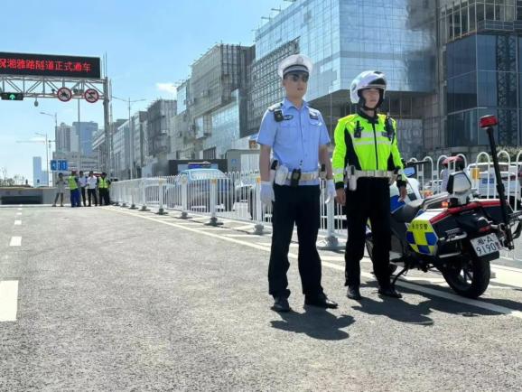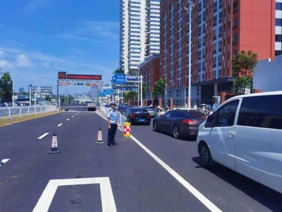 ▲开福交警大队民辅警在湘雅路隧道正式通车前加强周边道路交通疏导工作。交警提醒