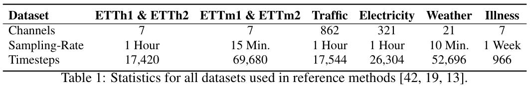 基准数据集。评估使用了以下真实世界数据集:ETT(其包含 4 个子集:ETTm1、ETTm2、ETTh1、ETTh2)、Illness、Weather、Traffic、Electricity。表 1 给出了这些数据集的统计情况。另外还有 Exchange Rate、Covid Deaths、Taxi (30 min)、NN5 (Daily) 和 FRED-MD。