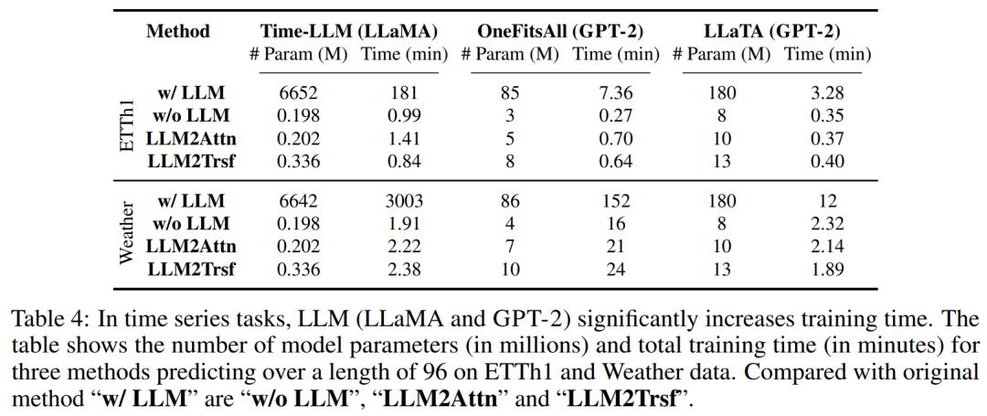 总体而言,如表 3 所示,在 8 个数据集和 2 个指标上,消融方法在 26/26 案例中优于 Time-LLM 方法,在 22/26 案例中优于 LLaTA,在 19/26 案例中优于 OneFitsAll。总之,很难说 LLM 可以有效地用于时间序列预测。