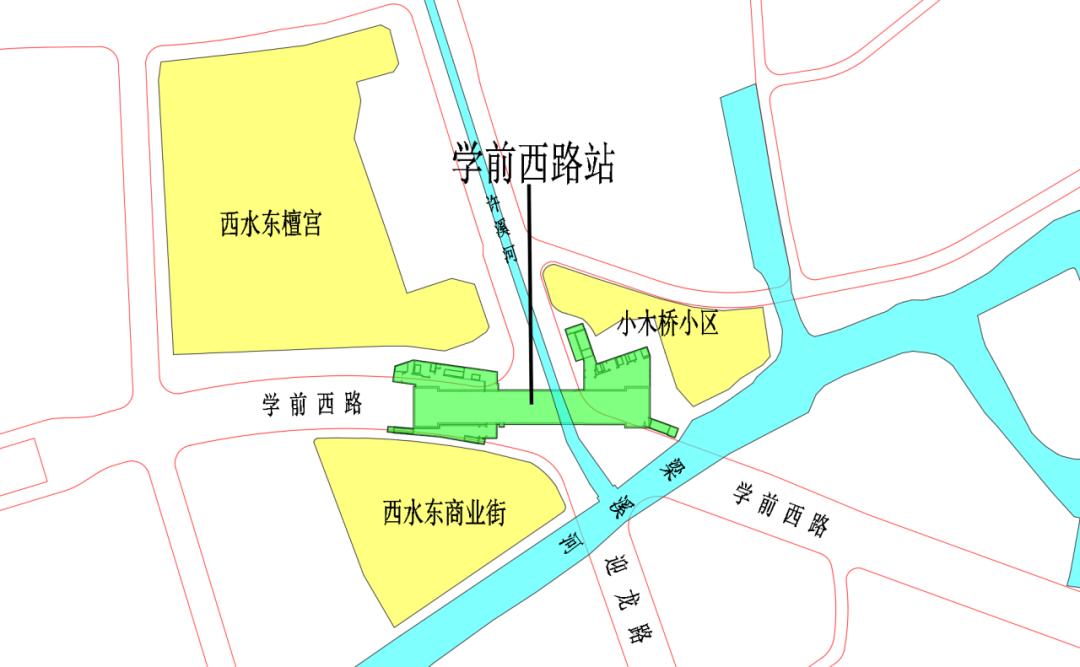 学前西路站为无锡地铁6号线第14座车站,位于学前西路与迎龙路交叉口、沿学前西路南北向布置。车站东侧现状为梁溪河,西南侧为绿地西水东檀宫小区,西北侧为低层待拆迁厂房,东南侧为西水东商业街,东北侧为老茂新桥,北侧为小木桥小区。