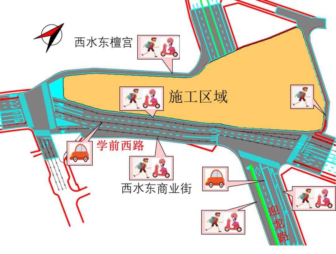施工期间,沿迎龙路往学前西路方向的机动车只允许右转,沿学前西路往迎龙路方向的机动车只允许直行和右转。非机动车、行人可根据交通信号灯指示沿人行横道线通过路口。
