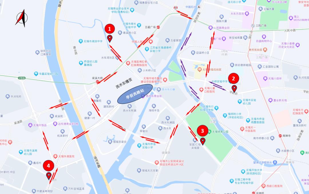 施工期间,学前西路导改至西水东商业街处,设置双向4车道及2条人非混行道。迎龙路方向机动车将不能通行,为了加强地铁6号线学前西路站周边道路“微循环”,建设团队在施工区域外围设置非机动车道,方便市民通行。