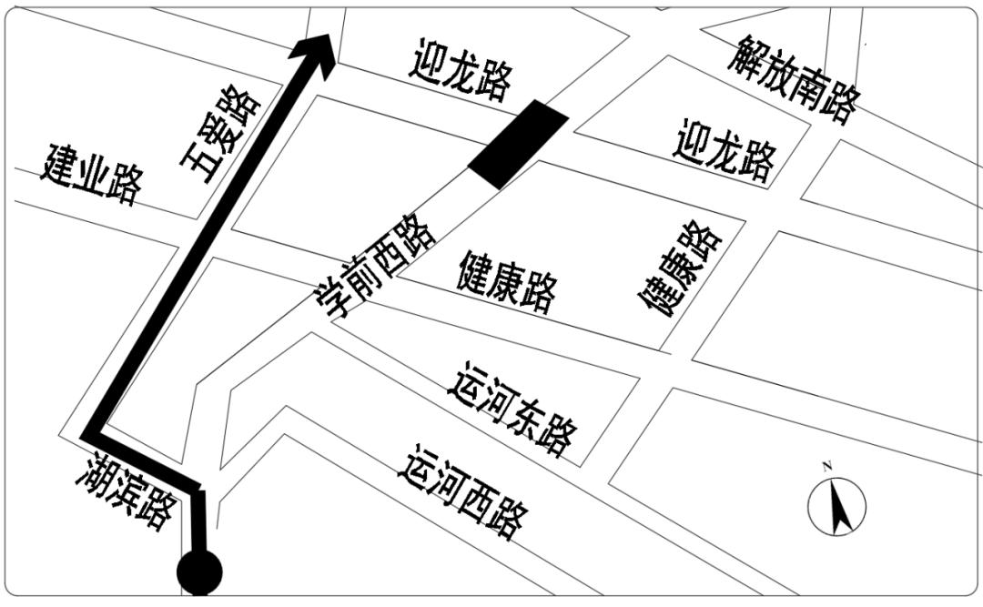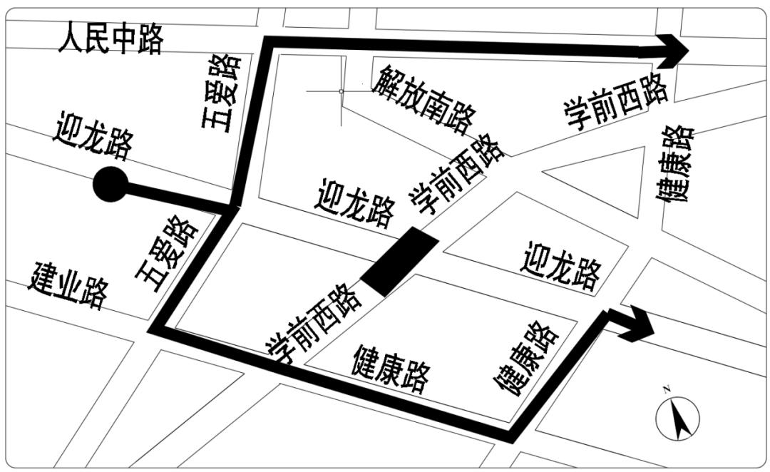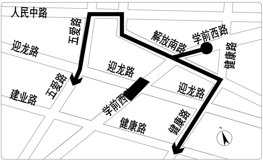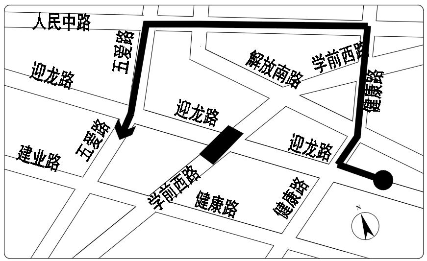 沿迎龙路方向行驶的机动车,可经五爱路向人民中路、健康路绕行。