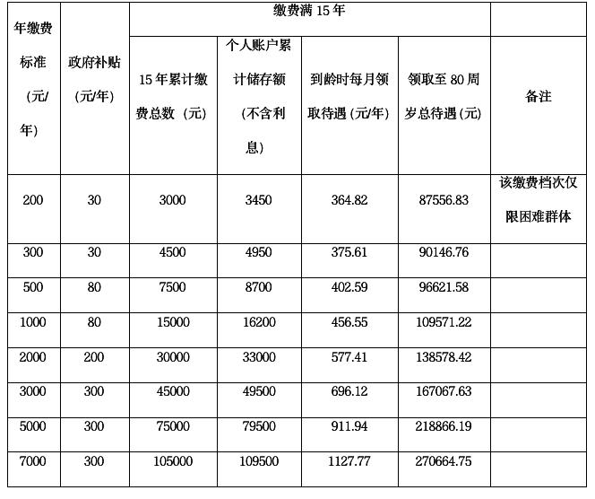 城乡居民基本养老保险不同档次待遇测算表