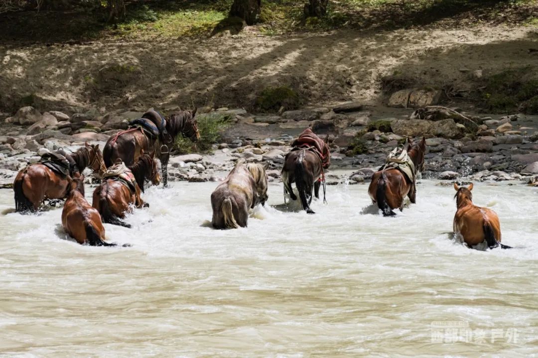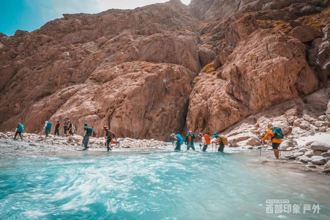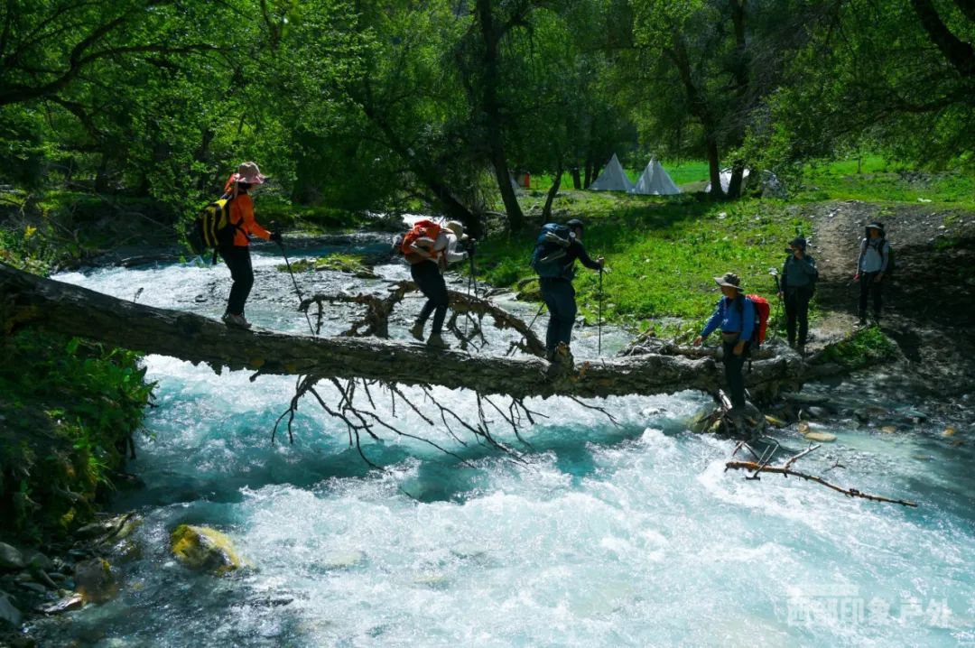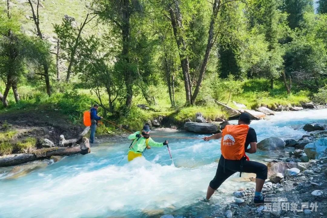 这里特别强调一下,乌孙古道沿途要过50多次冰河,冰雪融水形成的冰河!即使在烈日炎炎的夏季,河水温度也只有几度!寒冷刺骨,必须迅速通过,且要做好防失温的准备。过河溯溪鞋(或越野跑鞋)必备。