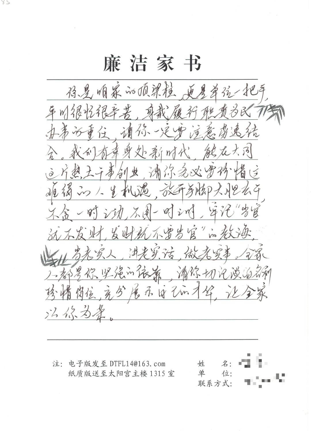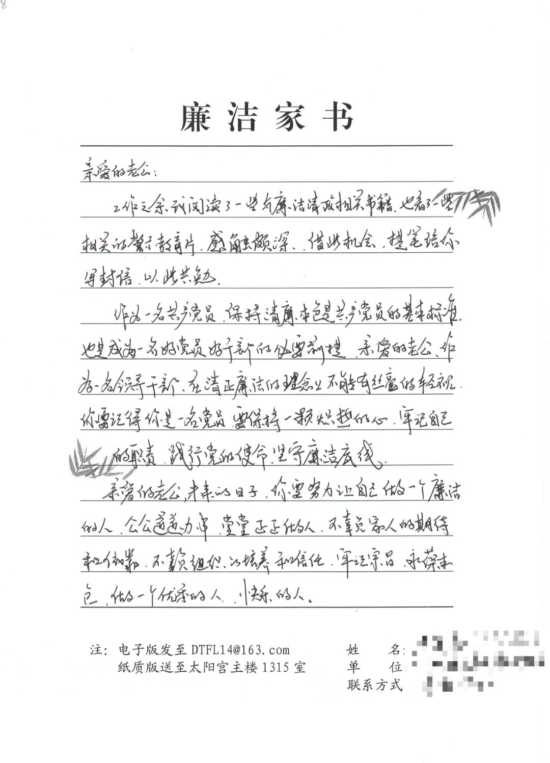 为深化家庭助廉效果,大同市纪委监委联合市妇联开展新时代廉洁家风“六个一”活动,组织干部家属为领导干部撰写“廉洁家书”,本期继续为大家展示部分优秀家书。