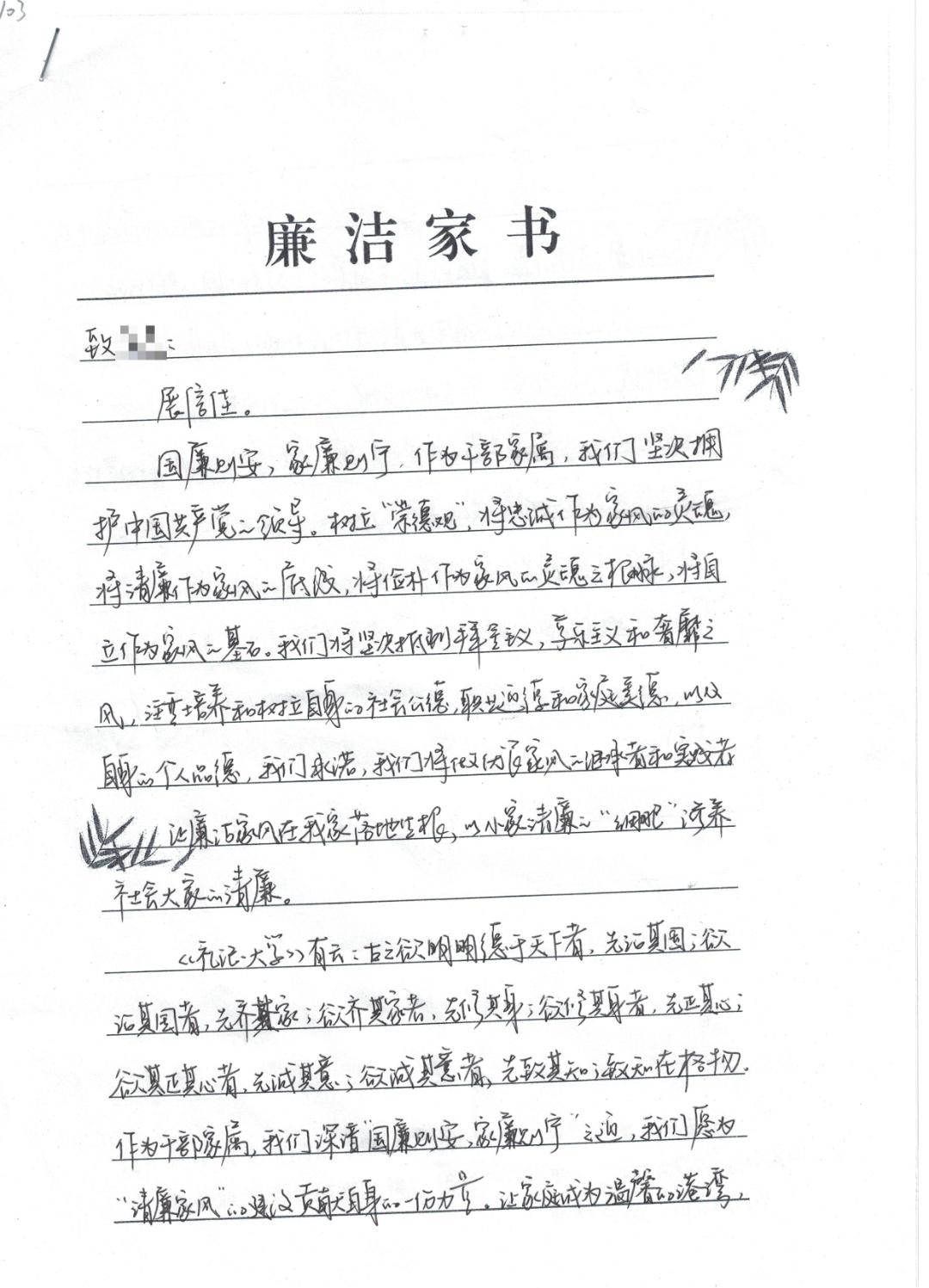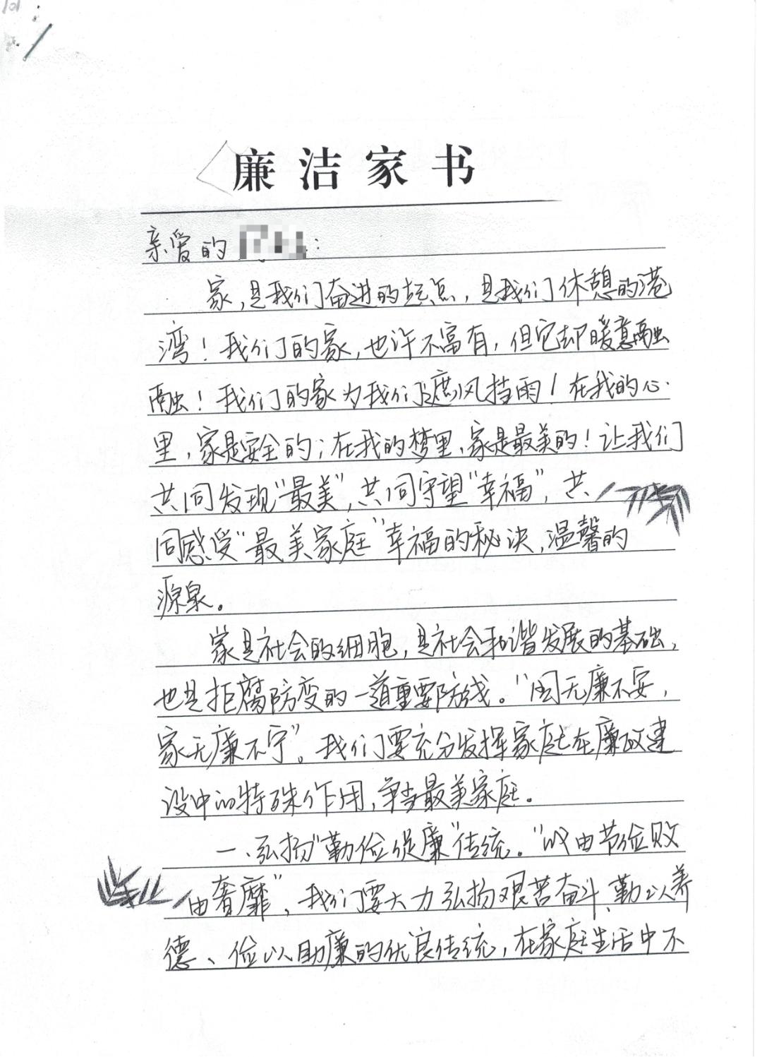 “天下之本在国,国之本在家。”“家风正,则官清;家风劣,则官浊。”“最是清风传家远,唯有廉洁守正心。”这一封封家书有对父母的深切感恩,愿传承家风、廉洁永续;有对爱人的深情寄语,愿携手奋进、廉洁齐家;也有对子女的深厚期盼,愿踏实做事、坦荡做人......