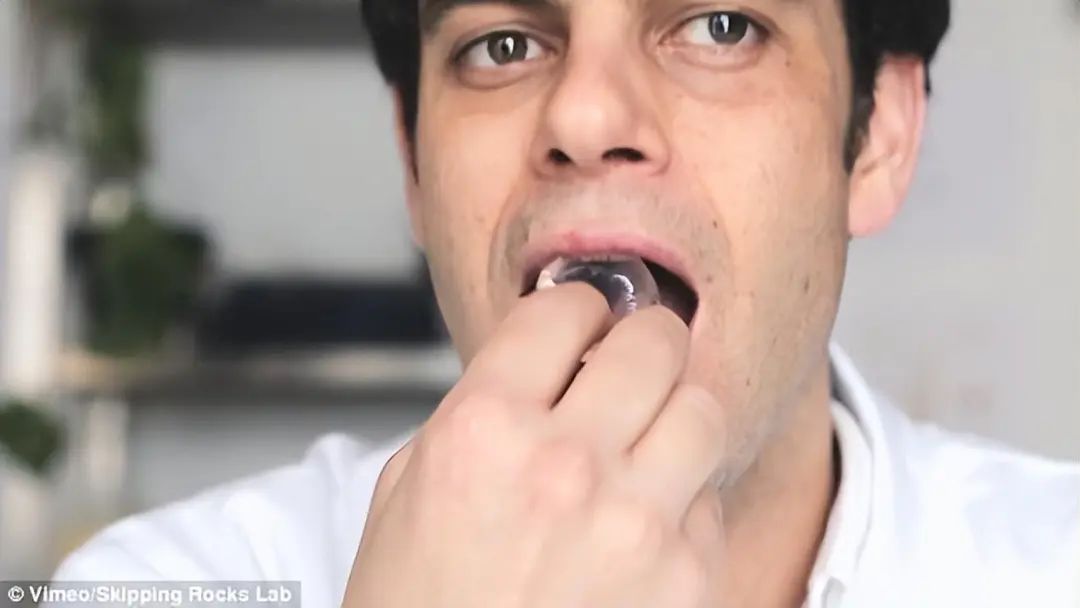 口渴的时候,只要将水球整个放进嘴巴里,轻轻一咬,液体就会在嘴里爆开,就能喝到水了。如果不想吃外面这层凝胶物质,也可以轻轻咬开一个口子,吸干里面的液体后再将外包装丢掉即可。