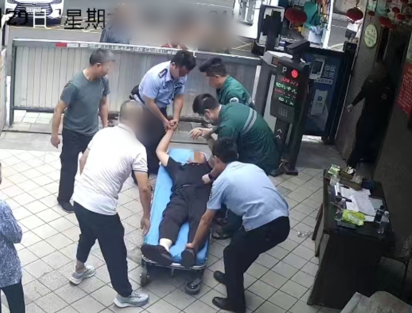 然而,当视频播放至22分56秒时,倒地的张经理想努力站起来,但挣扎后再次倒在民警面前。视频播放至35分左右时,一辆120救护车来到大门口,医护人员对他进行检查,播放至42分时,他被抬上救护车,此时距他倒地已过去大约40分钟。