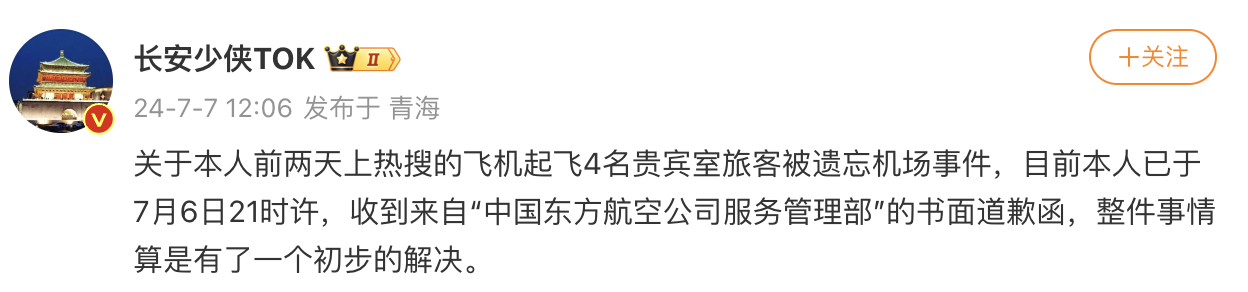 近日,“飞机起飞四名贵宾室旅客被遗忘机场”话题冲上微博热搜。7月7日,涉事旅客@长安少侠TOK 发布微博再次回应此事,其表示已于7月6日21时许收到来自“中国东方航空公司服务管理部”的书面道歉函,整件事情有了初步的解决。