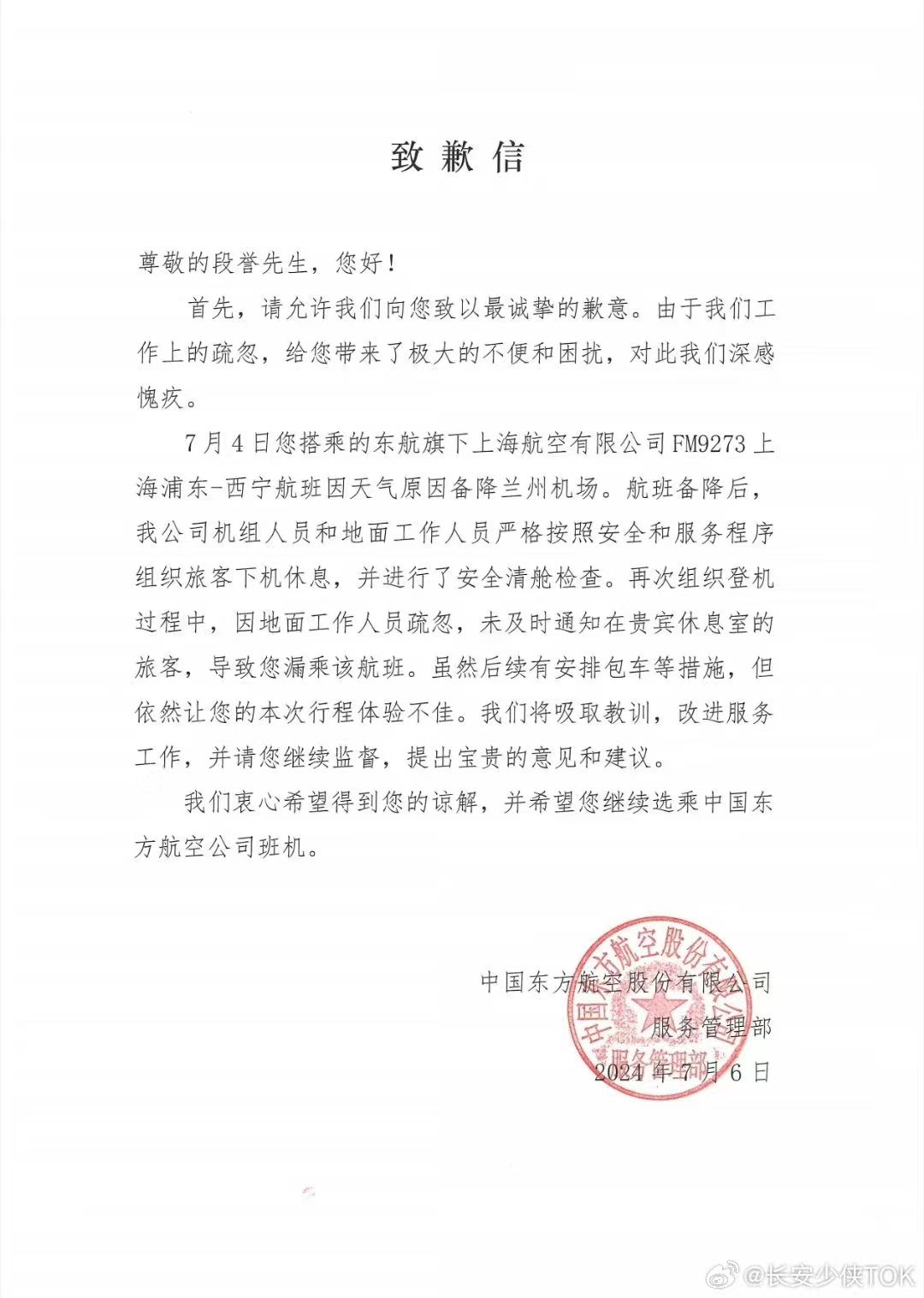 同时,该博主附上了一张落款为中国东方航空股份有限公司(以下简称“东航”)的致歉信。东航在信中表示: