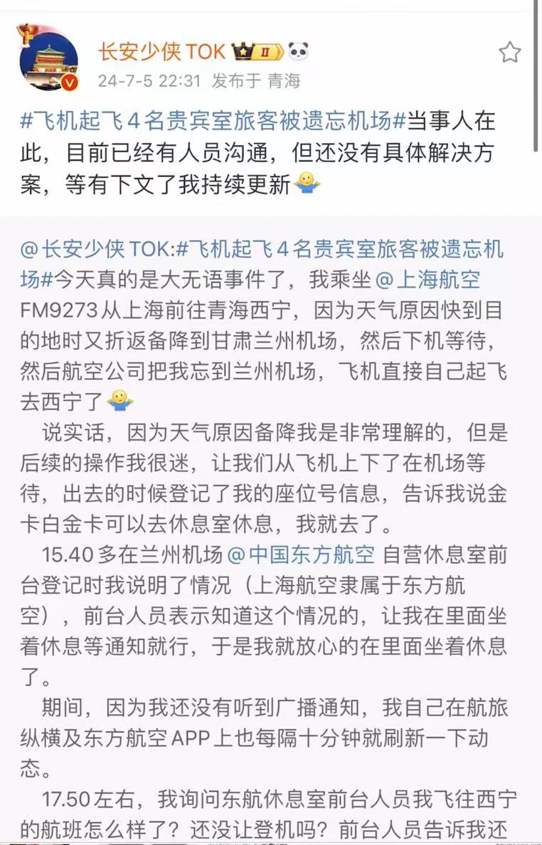 7月4日,段先生在其个人微博@长安少侠TOK 发文称,当天他乘坐由上海飞往青海西宁的上海航空FM9273航班,出于天气原因备降甘肃兰州。“当天14时42分,航班在兰州中川机场备降后,我们在飞机上等了半小时,随后又被告知需要带行李下机等待。”段先生说,他是航空公司白金卡会员,工作人员指引他到东方航空自营贵宾室休息等待通知。直到18时24分,他才得知航班已于17时左右起飞,而在贵宾室休息包括他在内的4名旅客都被遗漏。