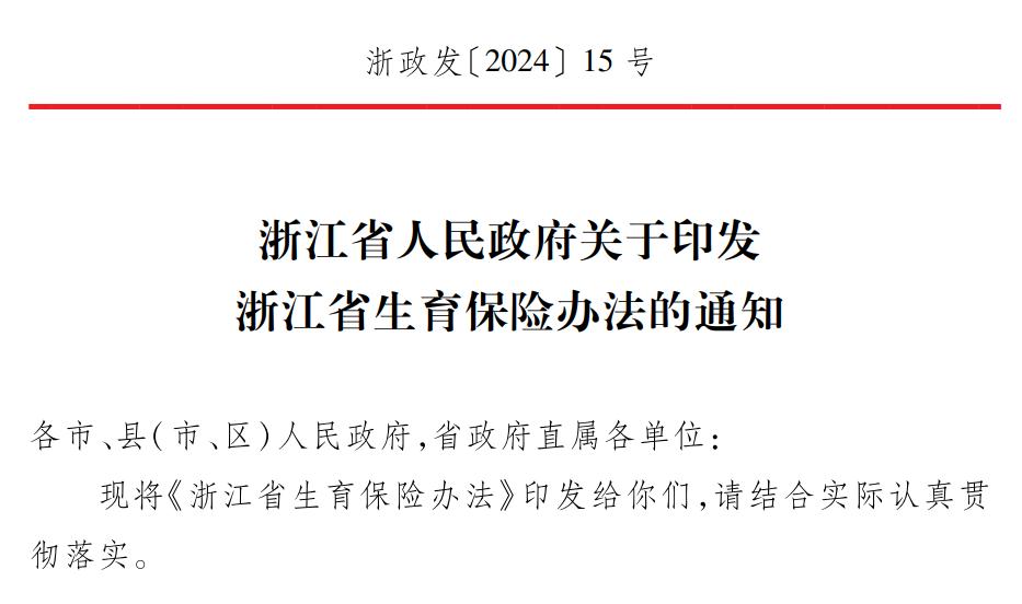 近日,浙江省政府网站发布《浙江省人民政府关于印发浙江省生育保险办法的通知》,通知明确,《浙江省生育保险办法》于2024年7月1日正式施行。
