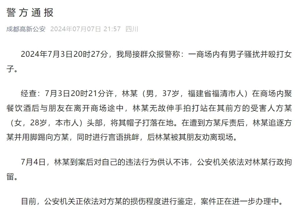 2024年7月3日20时27分,该局接群众报警称:一商场内有男子骚扰并殴打女子。