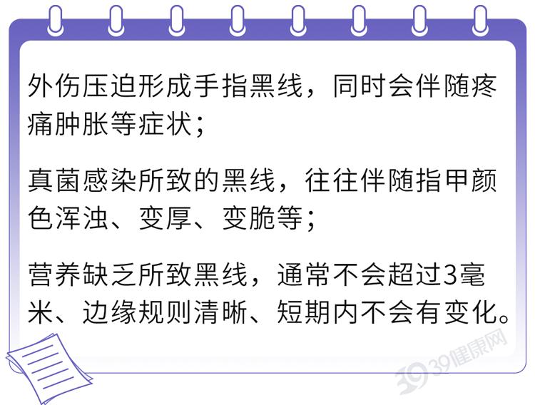 此外,外伤出血、真菌感染、营养缺乏等也可能导致手指出现黑线,大家要注意区分。