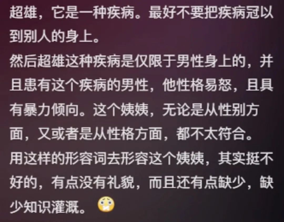 也有网友表示:用“超雄”这个病症来形容奶奶,是非常不礼貌、不合适的。无论如何,都不应该用这种贬义称呼给他人下定义。