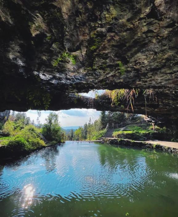 仙人桥“仙人桥”其实不是桥,而是一个顶上有“洞”的小池塘。从池塘里面看,刚好像一个“桥”。由于很多年前水溶作用,形成了天然的天窗、天生桥,在雨水充沛的季节,上游地表水从天窗流入下方水池,在阳光照耀下,形成晶莹剔透、形似串珠的水帘洞景观,非常漂亮。