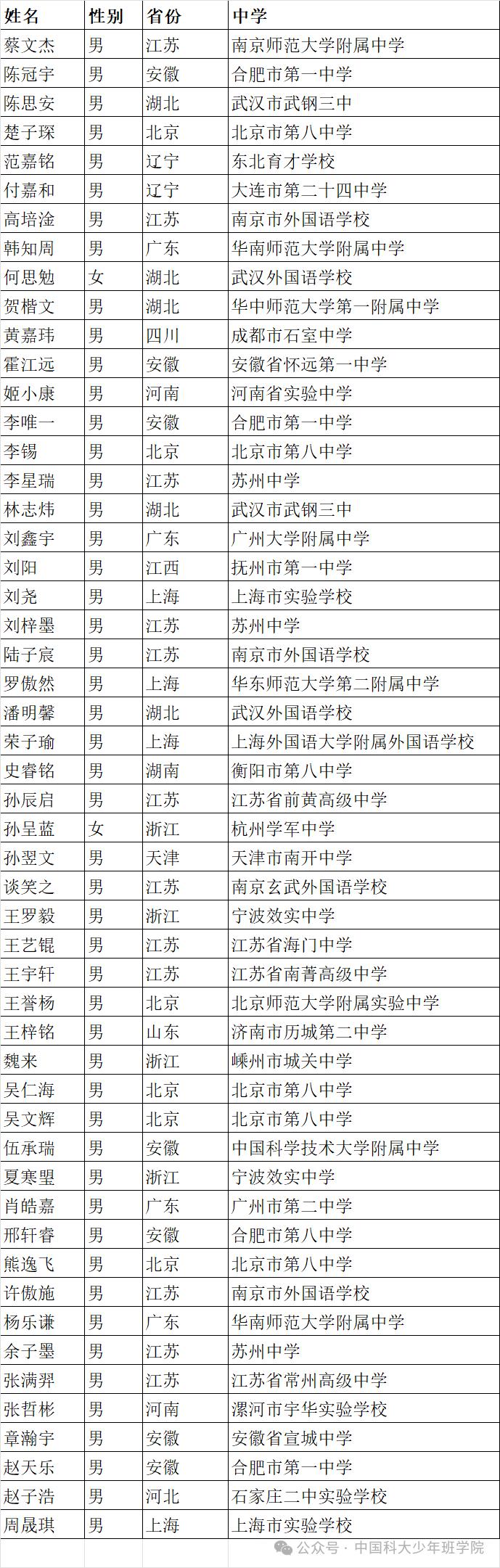 2024年少年班录取名单公示