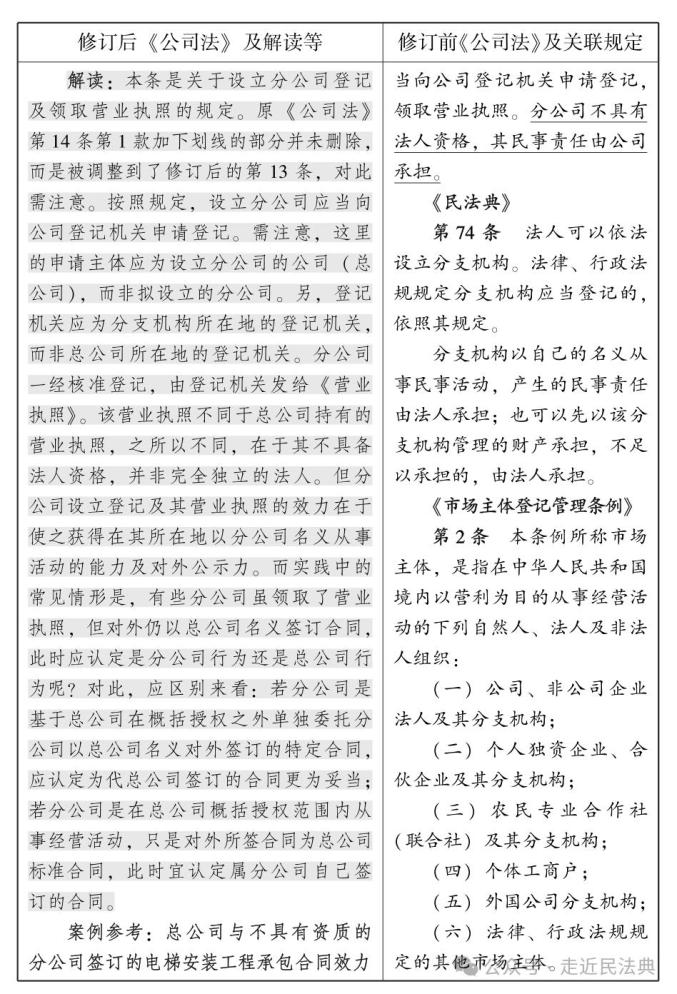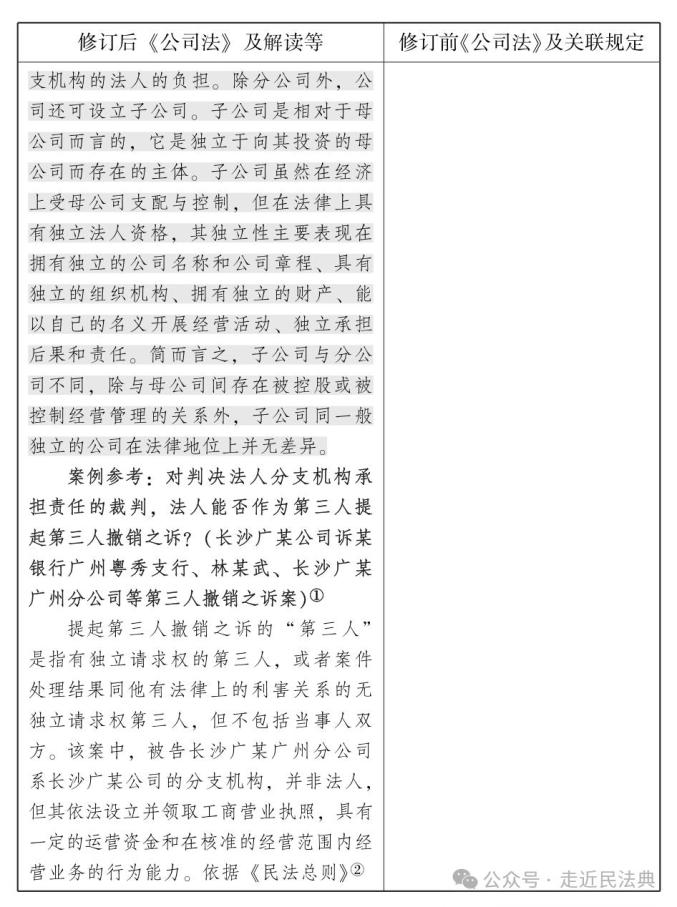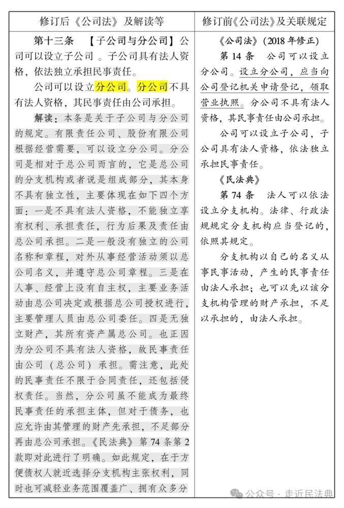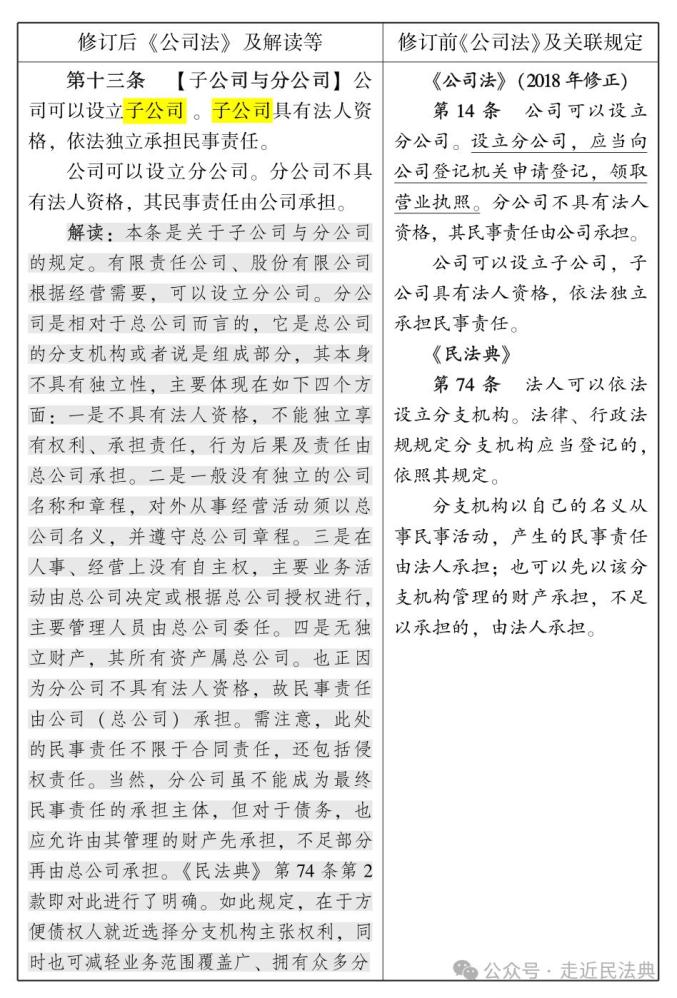 对公司法言,涉及分公司、子公司等的规定往往指向权利义务主体、责任主体问题,属较为重要的内容。2024年7月1日,修订后的《公司法》开始施行。此次修订后的公司法共5处涉分公司、8处涉子公司、2处涉母公司(已标黄处理),公司法语境下并无总公司的表述。现将上述规定分类梳理汇总如下(左栏为修订后的新公司法条文,右栏为原公司法条文及关联规定,下面为要点解读。点击图片可放大,浏览更清晰。因节选篇幅原因,条文所附案例及部分关联规定并未一并纳入):