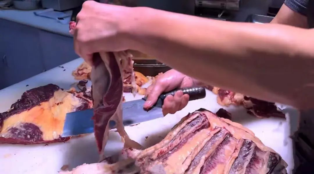 对于齐齐哈尔今夏在抖音上的突然爆火,本地人终于扬眉吐气了一把。在北京工作的齐齐哈尔人小同就是其中之一,“很多年前我就跟朋友推荐过我们那儿的烤肉,今年他们终于整明白了”。为了一尝烧烤之味,美食博主们齐刷刷前往齐齐哈尔,吸引了一波又一波美食爱好者打卡探店。“这…这么野生呢?这不会是刚宰的吧?” 美食博主张喜喜看见齐齐哈尔烤肉的第一反应,就是这样一句话。随着她的镜头,一个长相与菜场里的肉铺门脸完全没有区别的铺子出现在眼前,牛肋条、牛大腿、牛筋、牛膘等就这么鲜红带赤的横躺在白色大砧板上,“昨天大半夜刚宰的”,老板边说边磨起了刀子,“要哪块儿?” 然后对着肥瘦相间的一块肋条肉就切了下去。“我给你搭配着哈,太瘦了不香啊。” 喜喜随即问出价格——“41一斤啊,四个人吃两斤差不多了,咱守着肉店,想吃再加”。