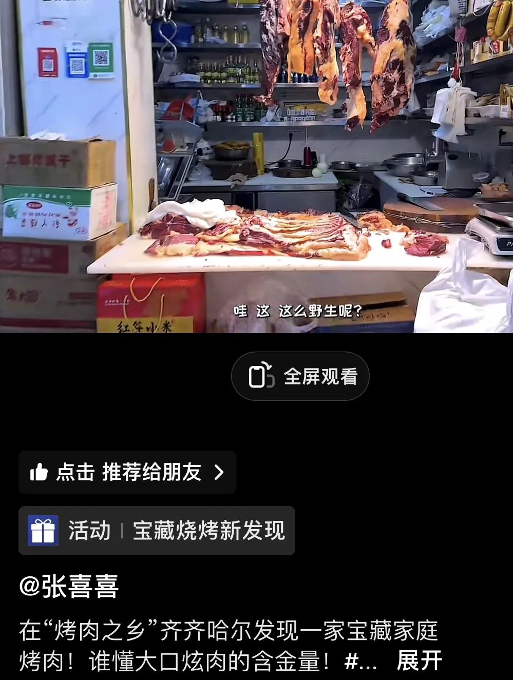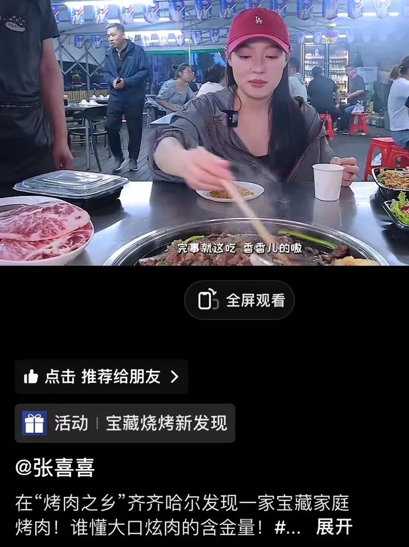 张喜喜正在吃烤肉事实也的确如此。喜喜的评论区里随处可见“预算XXX千,能去齐齐哈尔吃几天?”“我素未蒙面的齐齐哈尔朋友们,这肉真的犹如我想象的那么好吃么?”;本地人也不藏着掖着,评论区内认真解惑“可以齐齐哈尔+哈尔滨玩半个月了”“我齐齐哈尔人,只能说比你想象的更好吃”“米家、撒撒米都好吃” ……