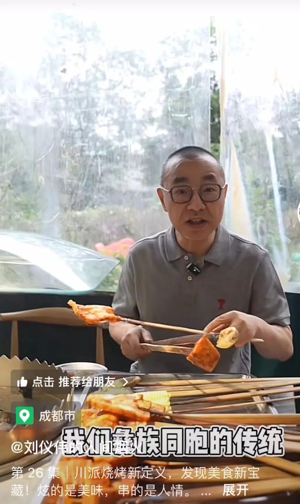 图源 @伊博看着美食节目主持人刘仪伟烹饪节目长大的中年人,借助熟悉的刘式温柔,了解到原来四川的西昌烧烤源自彝族,用巨大的签子对着火盆,智识与胃能同时得到满足。