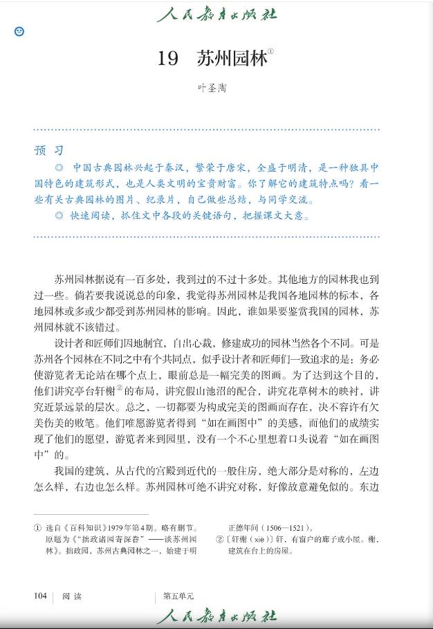 要想鉴赏园林,叶圣陶先生的《苏州园林》可算是最佳导览。这篇文章收录在统编语文教材八年级上册,原本是为陈从周教授编撰的园林图册所作之序。