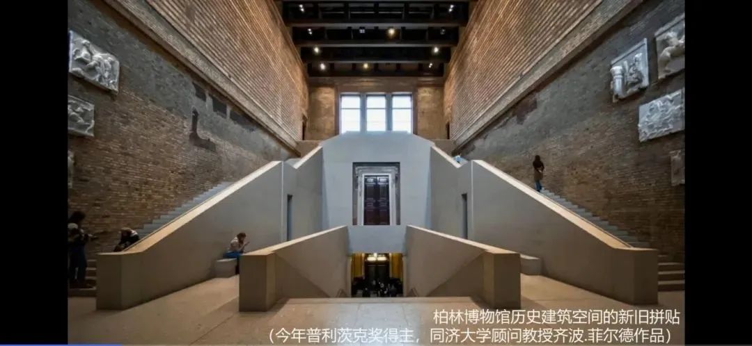 一张是科隆柯伦巴艺术博物馆教堂废墟与馆体的新旧拼贴,这是普利兹克奖得主卒姆托的作品;另一张是柏林博物馆历史建筑修复中的新旧拼贴,这是普利兹克奖得主、同济大学顾问教授齐波·菲的作品。两个设计共同的特点是,新旧拼贴允许可识别的新旧形体、材料和工艺形成呼应或对比。