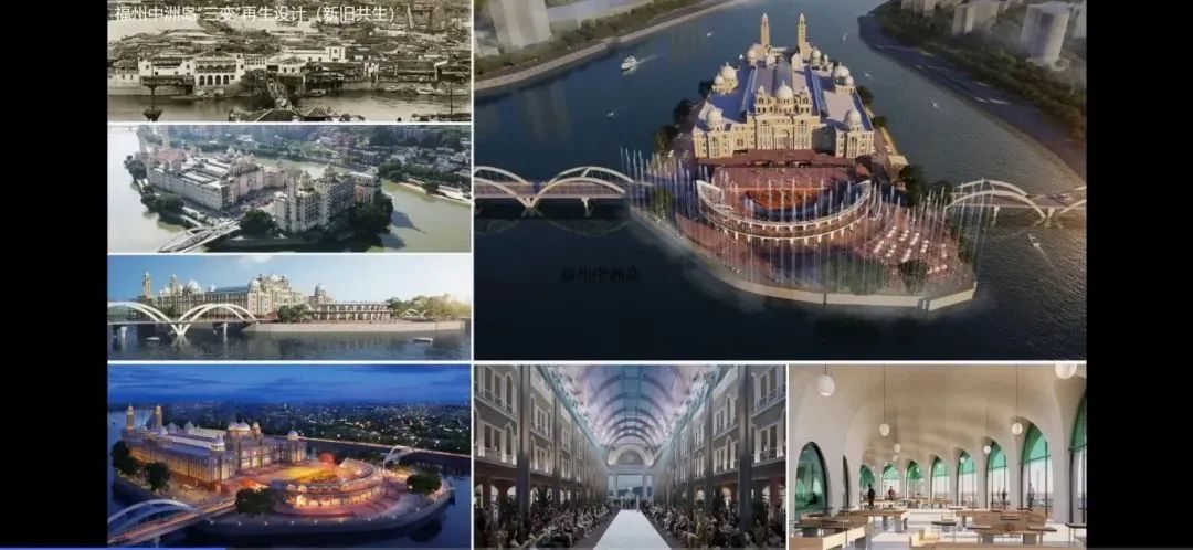 正在施工中的福州文化轴上的闽江中洲岛,也是一个新旧共生的例子。岛上20年前建造的“欧陆风”建筑,如今已经破旧不堪,到处漏雨,门可罗雀。这样的建筑怎么办?常青团队把西边更低质的建筑拆掉,新建公共性很强的露天演场,既是市民表演才艺的场所,也可用于演出,看台下面是百米咖廊。这座建筑以现代空间拱券塑形,与保留的“欧陆风”建筑拱顶穹窿及拱券门窗形成类比,和而不同。