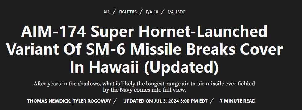“超级大黄蜂”和AIM-174B超远程导弹的这对组合早在3年前就被发现,但当时导弹涂着黄色的试验涂装,且美国海军从来没有正式承认。如今该导弹已经由美国海军航母舰载机正式挂载,并采用灰色的标准涂装,表明它的性能逐渐成熟可能具备作战能力。报道提到,“考虑到中国正在部署自己的超远程空对空导弹,美国海军装备这种远程导弹将带来巨大优势”。例如美国空军可以使用AIM-174B导弹在极远距离对付空中预警机、侦察机、海上巡逻机、空中加油机以及轰炸机等笨拙的大型飞机。“这将是帮助美国对抗中国反介入/区域拒止战略的关键方法之一。”