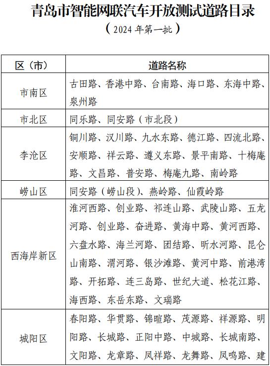 经道路测试主体申报、市智能网联汽车道路测试与示范应用联席工作小组研究,现将青岛市智能网联汽车开放测试道路目录(2024年第一批)公布如下: