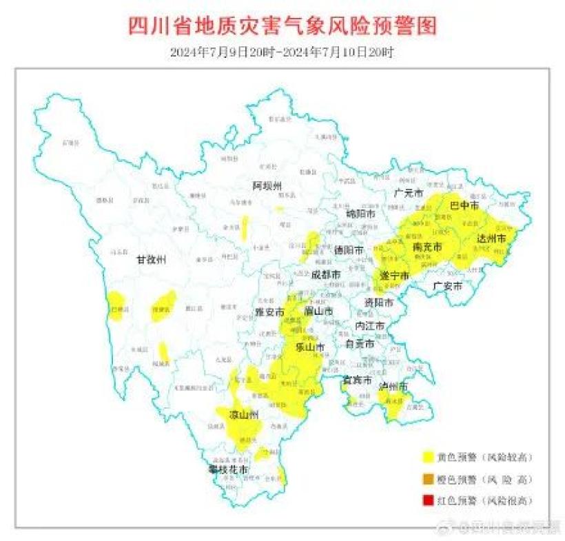 四川地灾预警区域再次扩大,涉86个县市区根据四川省气象台天气预报情况,结合四川省地质环境条件,7月9日20时至7月10日20时,全省地质灾害气象风险预警结果如下: