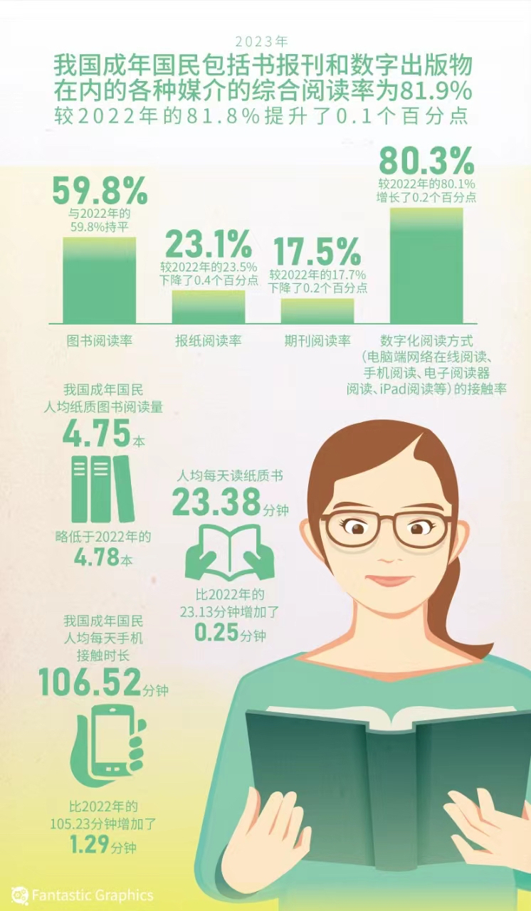 第21次全国国民阅读调查报告显示,2023年我国成年国民包括书报刊和数字出版物在内的各种媒介的综合阅读率为81.9%,较2022年的81.8%提升了0.1个百分点。图书阅读率为59.8%,与2022年的59.8%持平。数字化阅读方式(即电脑端网络在线阅读、手机阅读、电子阅读器阅读、iPad阅读等)的接触率为80.3%,较2022年的80.1%增长了0.2个百分点。单从电子书来看,2023年我国成年国民人均电子书阅读量为3.40本,高于2022年的3.33本。有12.3%的人年均阅读10本及以上纸质图书,年均阅读10本及以上电子书的则为9.9%。