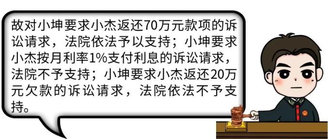 由于担心影响自己银行征信记录,小坤无奈之下只能先向银行还款。两年下来,小坤已经代小杰向银行还款70余万元。在小坤的强烈要求下,小杰出具一张70万元的借条,并约定按月利率1%的标准向小坤支付利息。到了2024年,小杰仍拒不还款,忍无可忍的小坤向法院起诉,并称出具借条后又替小杰还款20万元,现要求小杰返还90万元,都按月利率1%支付利息。