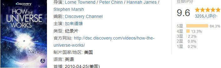 接下来这部物理纪录片《宇宙有道理》(How the Universe Works),也很有来头。它是大名鼎鼎的美国探索频道(Discovery Channel)出品的一系列探索宇宙奥秘、天文知识的纪录片。因为每季出来后都大受欢迎,现在这个系列已经出到第八季了!而且每一季的豆瓣评分相当高,都在9.6分左右。