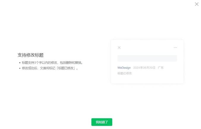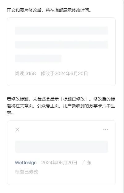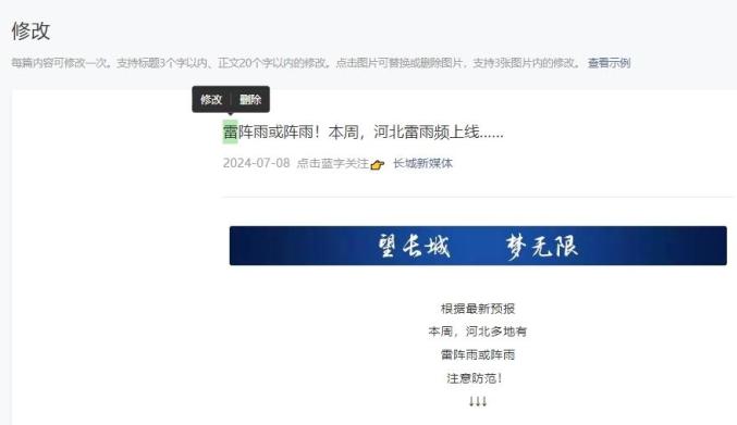 根据微信公众号后台提示,现支持标题3个字以内,正文20个字以内的修改,若修改标题,文首还会显示“标题已修改”。修改后的标题将在文章页、公众号主页、用户新收到的分享卡片中生效。