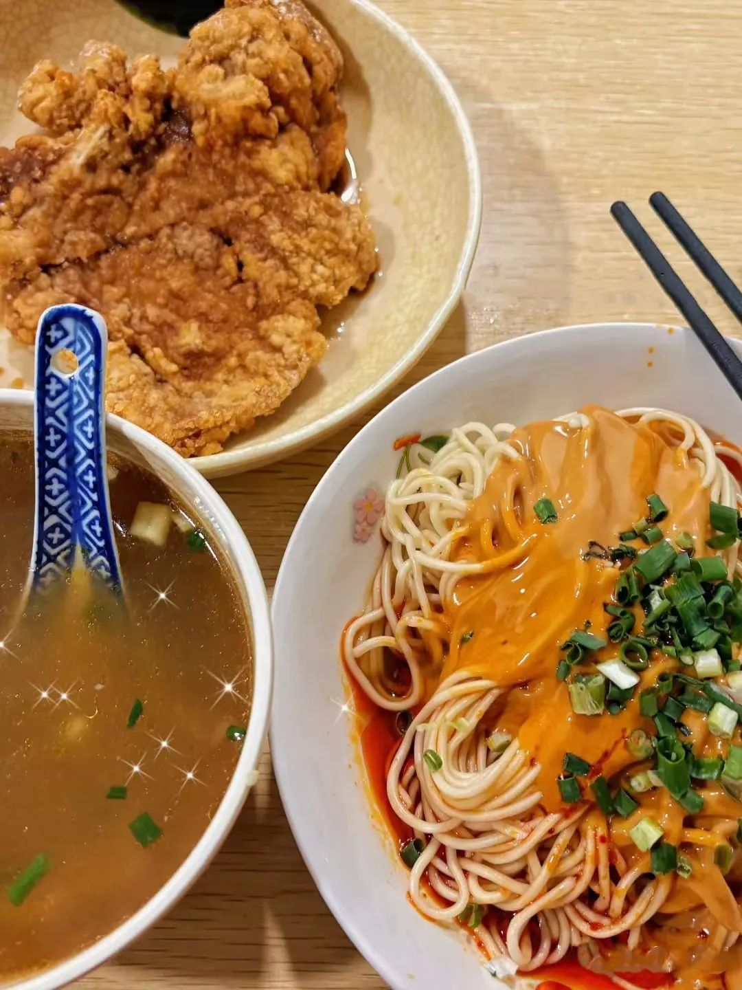 辣肉面也不错吃,肉丁煮得酥软。还有麻酱馄饨也很受欢迎,出人意料扎实的馅,一个馄饨下肚特别满足。