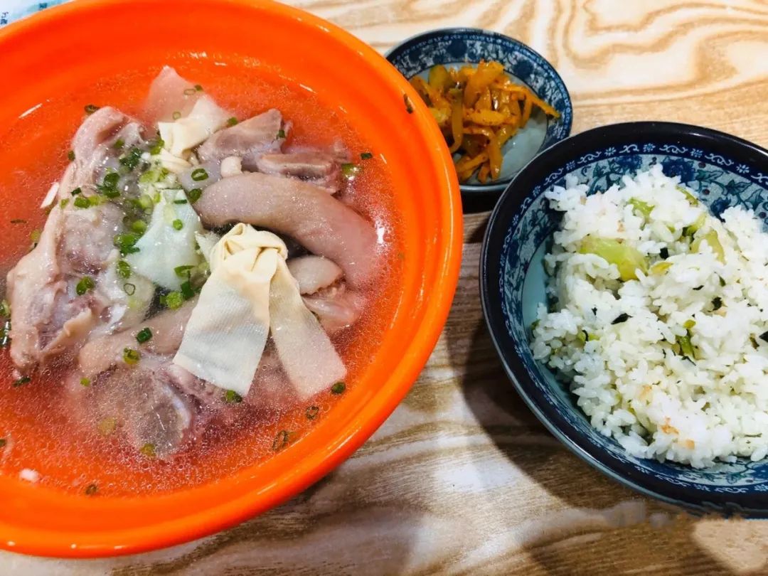 店里还有各种菜饭骨头汤,虽然中规中矩,但价格实惠。一个人来点一碗菜饭,就一口清汤;或两个人来点一碗盖浇面,多炒两个浇头……丰俭由人,吃饱也能吃好。