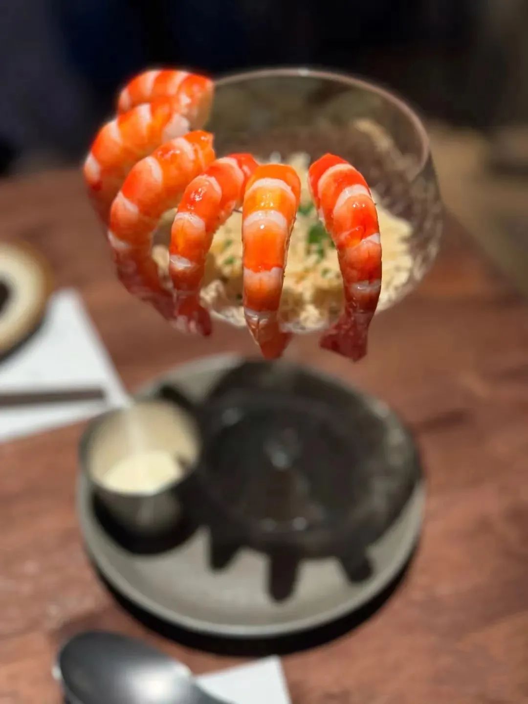 配色和摆盘超美的沙姜脆脆黑虎虾,虾的个头很大,肉质饱满均匀,蘸酱是混合着沙姜味的蛋黄酱,给菜带来一种微妙的风味,再蘸上脆米后口感非常丰富。