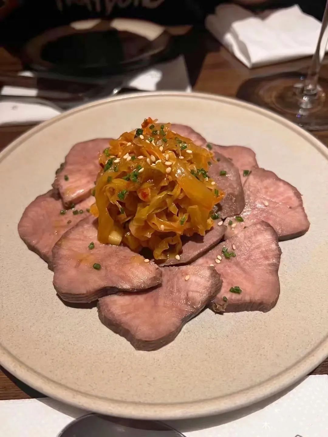 必点的卤牛舌,是豪爽的厚切,但卤得入味;牛舌上的川式泡菜拿红油调过,酸辣脆爽,量超足;芒果丁带了一点酸甜,整体来说极其下酒。走地鸡也可圈可点,嫩煎的鸡肉配上肥糯厚实的酱茄子,再蘸上鲜打的玉米酱汁,香甜厚实更上一层。