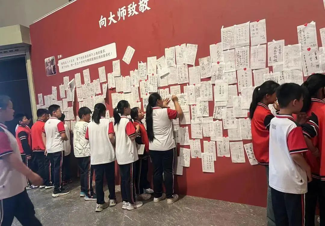 自展览开展以来,这面红色的留言墙,每天都会迎来大批观众在此驻足、留言,有白发苍苍的耄耋老人,有稚气未脱的天真孩童;有各领域的专家学者,有高校里的莘莘学子;有外地的游客,有家乡的父老......每一名观众在仔细看完整个展览后,都会沉浸在一种震撼感动、正气浩荡、若有所思的情绪氛围里,大家怀着深深的敬意,静静地把想对大师说的话一气呵成、融入笔端、呈于纸上。