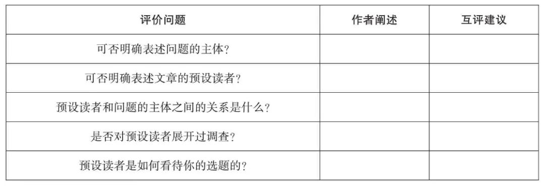 选题自评意在引导学生通过对照评价表来检验选题是否有价值,其质量如何。以往在课程中设置的选题评价表主要以问题意识为核心,但效果并不尽如人意。比如当题项表述为“有没有提出问题”时,学生大多会回答“是”。表面看来,选题只要可以表述为一个问句,即表明提出了问题。但如果深究这个问题是不是需要用一篇文章来回答,则答案可能不一样。当题项表述为“问题是否明确而集中”时,大部分学生也会回答为“是”。只要选题表述足够简短,就算是符合要求。但只要进一步思考,即可发现越是简短的表述其指向越可能模糊不清。这样一路勾选下来,从表上看似乎可以获得较高的分数,但它对优化选题的作用却是有限的。学生似乎往往通过填写表格掌握了选题的理论标准,但这对他们的写作实践帮助并不大。因此,在课程设计中把对问题意识的提问具体化为对读者意识的觉知,改进了选题评价表,大致如下: