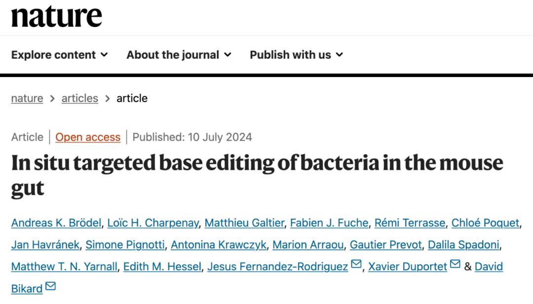 2024年7月10日,基因编辑公司 Eligo Bioscience 的研究人员在国际顶尖学术期刊 Nature 上发表了题为:In situ targeted base editing of bacteria in the mouse gut 的研究论文。