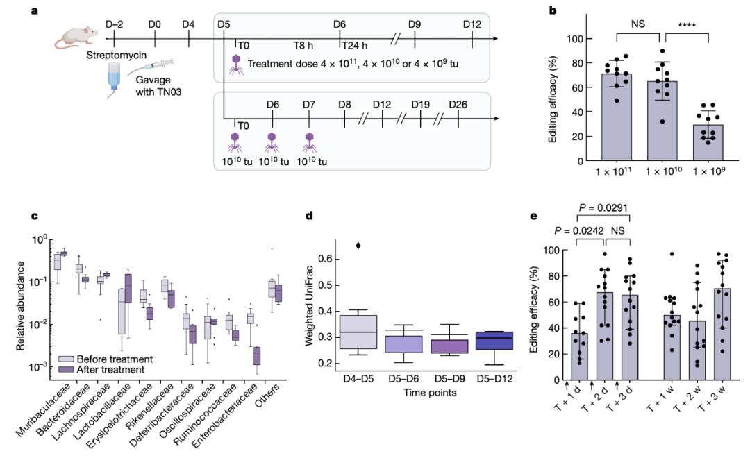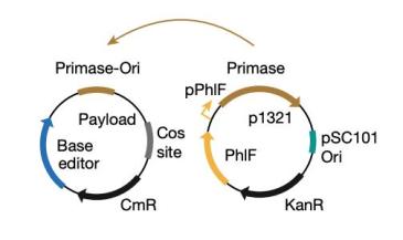 此前向小鼠肠道中大肠杆菌进行DNA递送的研究,要么依赖于M13噬菌粒,要么依赖于基因修饰的λ噬菌体。M13噬菌粒以F菌毛作为受体,这限制了其范围,并且M13在通过小鼠胃肠道时不稳定。而λ噬菌体,在感染大肠杆菌时,λ要么进入裂解周期并产生更多的病毒颗粒,要么进入溶原化并整合到染色体中(从而能够维持递送的诸如I型 CRISPR–Cas系统或dCas9等转基因)。最近还有研究在λ噬菌体基因组中引入了碱基编辑器,尽管其能够在肠道环境中繁殖,但λ噬菌体无法使整个目标群体溶原化。