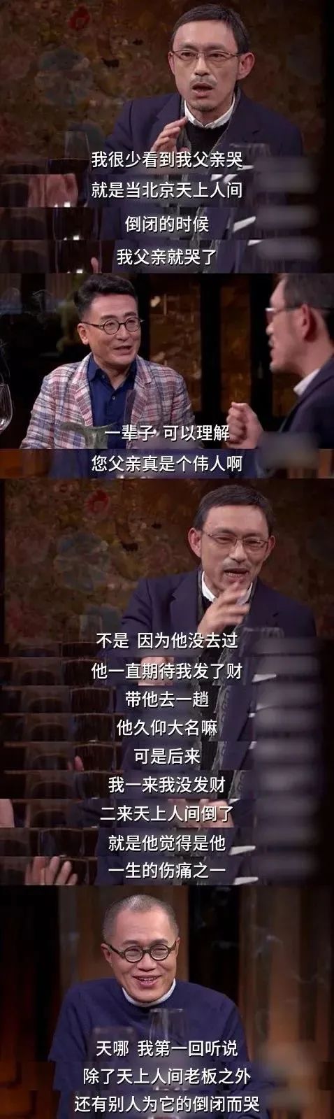 父亲最大的遗憾是没去过天上人间,当年北京天上人间倒闭的时候,马家辉的父亲哭了,他一直等着儿子发财带自己去潇洒一回,谁知儿子没发财,天上人间还倒闭了。